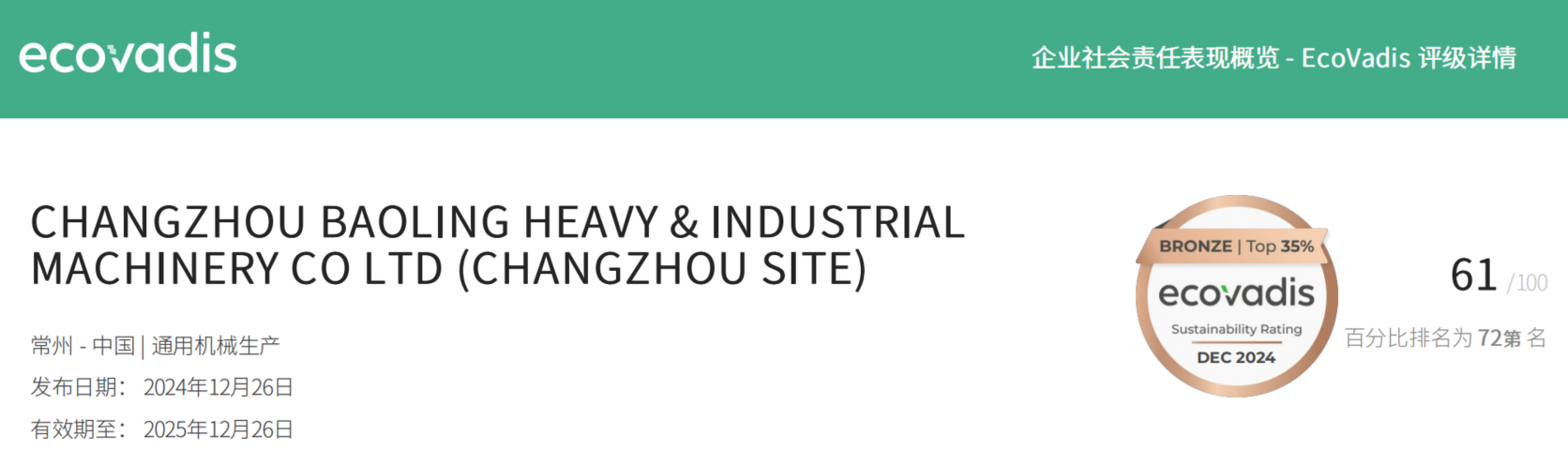 2024年12月26日,寶菱重工在EcoVadis企業(yè)社會(huì)責(zé)任評(píng)估中得分61分,并榮獲“銅牌”,在EcoVadis所有在評(píng)公司中躋身于前 35%(已超過 65% 以上的公司)。當(dāng)前,“環(huán)境、社會(huì)責(zé)任和公司治理”(簡稱:ESG)水平已成為衡量企業(yè)長期價(jià)值和可持續(xù)發(fā)展能力的關(guān)鍵因素,其核心在于“友好環(huán)境、尊重員工、合規(guī)經(jīng)營、可持續(xù)發(fā)展”。公司將可持續(xù)發(fā)展理念融入企業(yè)戰(zhàn)略與日程經(jīng)營活動(dòng)中,推動(dòng)導(dǎo)入ESG